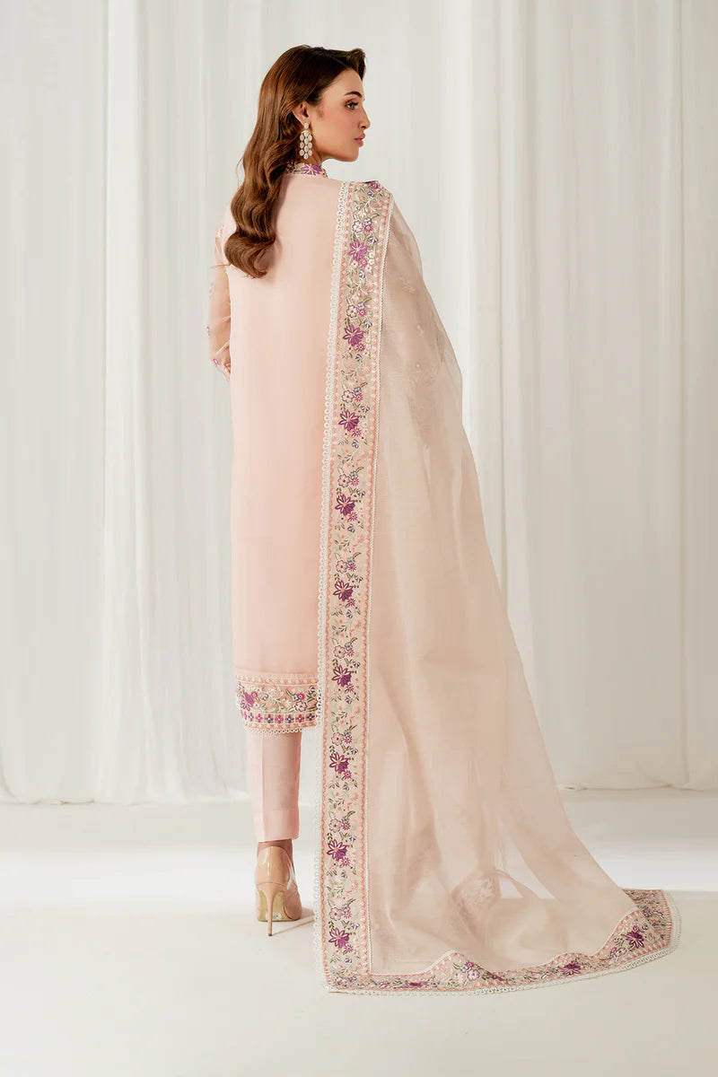 Embroidered chiffon front (1 yard)Dyed chiffon back (1.25 yard)Embroidered organza neckline patch (1 piece)Embroidered chiffon front & back border (1.80 yard)Embroidered organza front & back border (1.80 yard)Embroidered chiffon sleeves (0.75 yard)Embroidered organza sleeves border (1.08 yard)Dyed cotton net dupatta (2.75 yard)Embroidered cotton net dupatta border (8.5 yard)Dyed silk trouser...