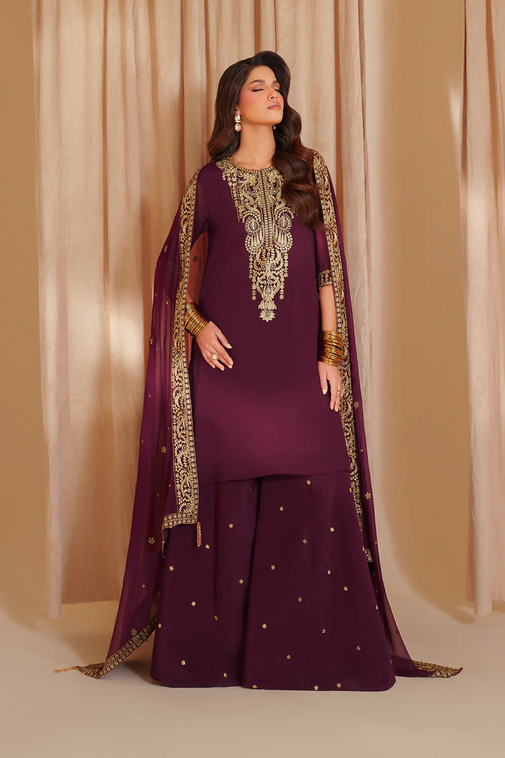 Shirt Front: Embroidered ChiffonShirt Back: Dyed Chiffon Sleeves: Embroidered Chiffon(0.65 M) Dupatta: Embroidered Chiffon(2.5 M) Trouser: Embroidered Raw Silk(3. M) All colours may vary due to shoot & light.