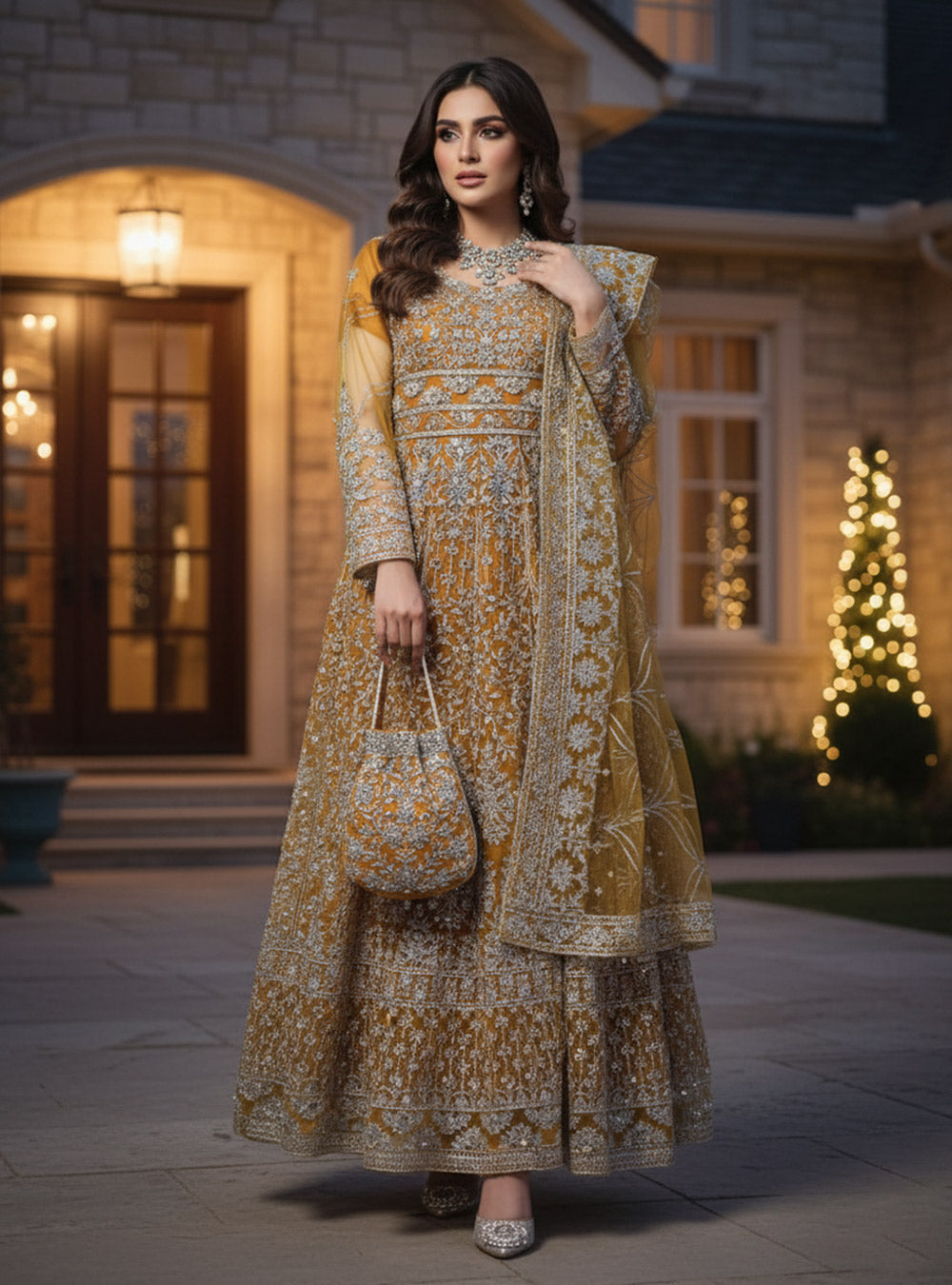 This stunning outfit features a delicate Mustard Yellow Net Gown with an elegant maxi length (61"). The gown and its matching dupatta offer an ethereal drape and a graceful silhouette. The ensemble is lavishly adorned with intricate embroidery, shimmering pearls, and subtle mirror work, creating a luxurious texture and glittering finish that catches the light beautifully. The soft mint hue is perfectly complemented by the opulent embellishments, making this a perfect choice for formal gatherings and celebrations.