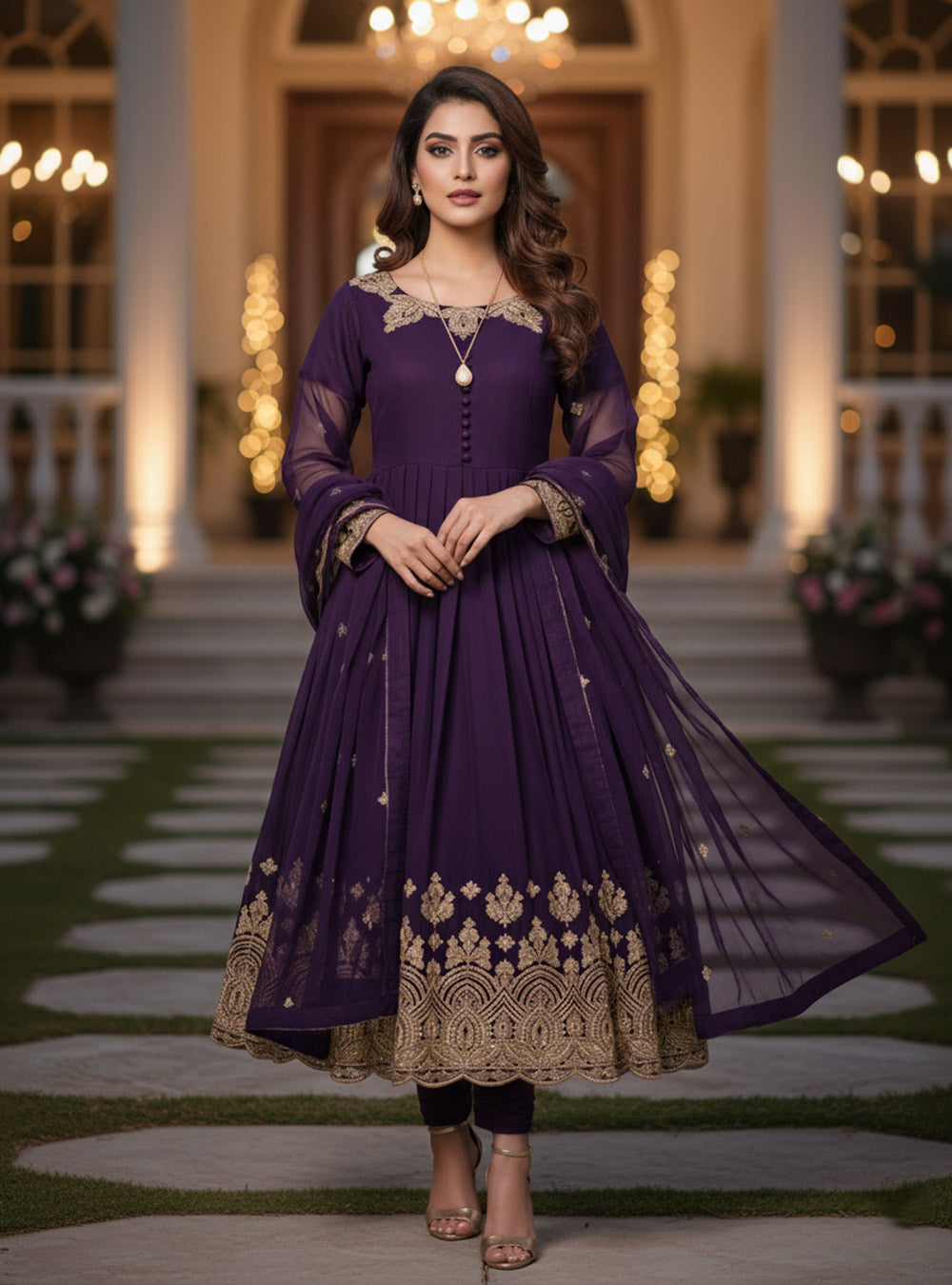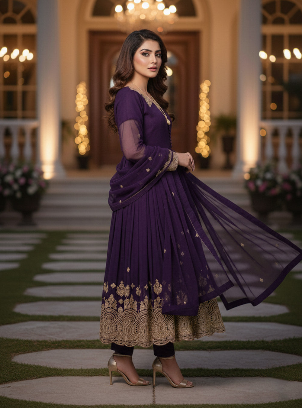Drape yourself in sophistication with the Elegant Chiffon Ensemble, a timeless three-piece outfit perfect for formal events and celebrations. This beautiful suit features a flowing chiffon shirt and dupatta, renowned for their light texture and graceful movement. The sheer chiffon is elevated by intricate Tilla embroidery—a luxurious needlework technique using gold or silver...