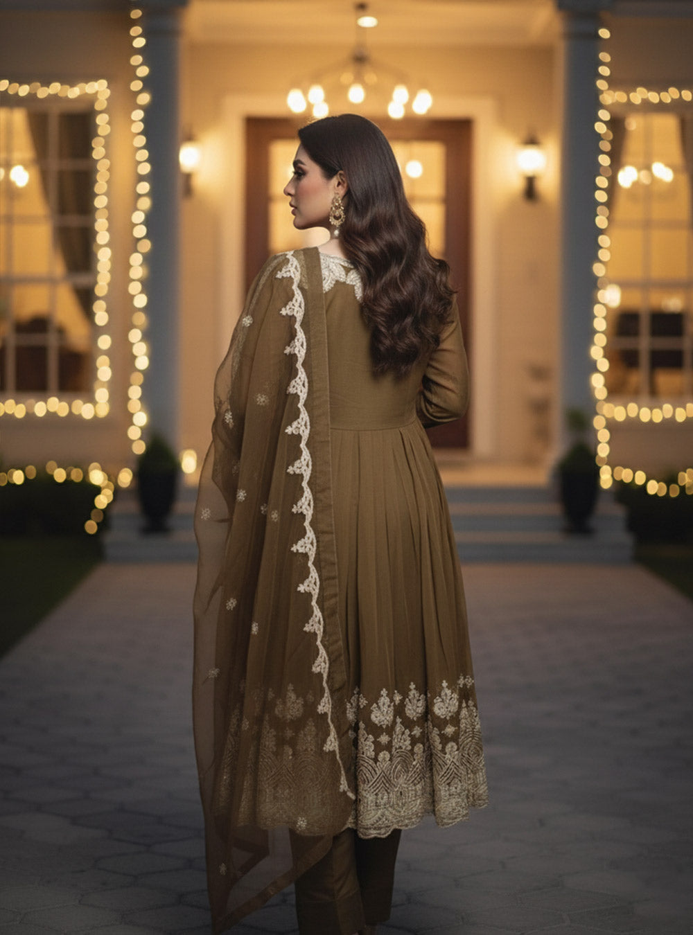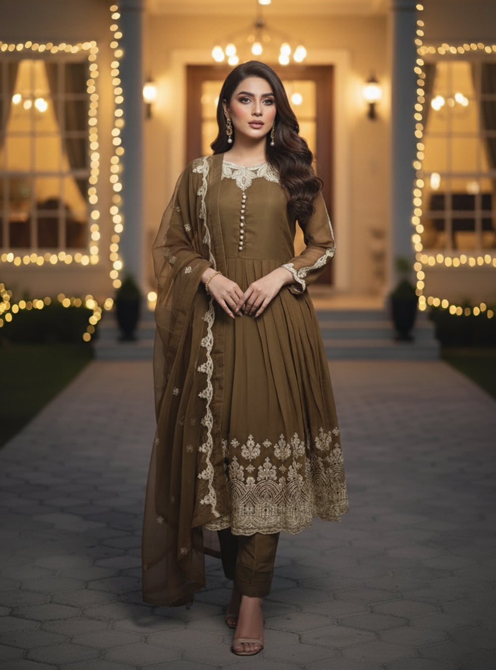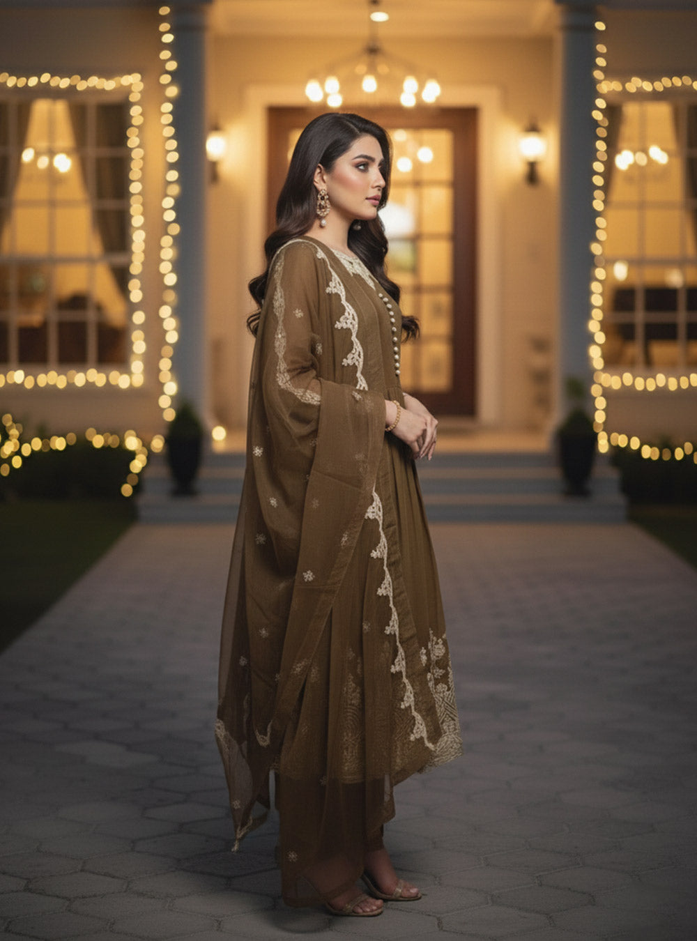 Shahnoor - 3pc Stitched Luxury Formals - Brown Gold Hazelnut