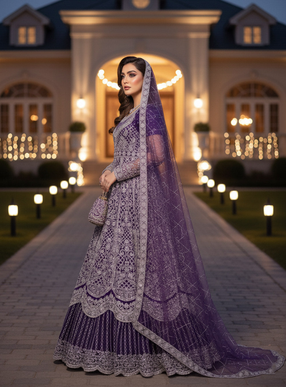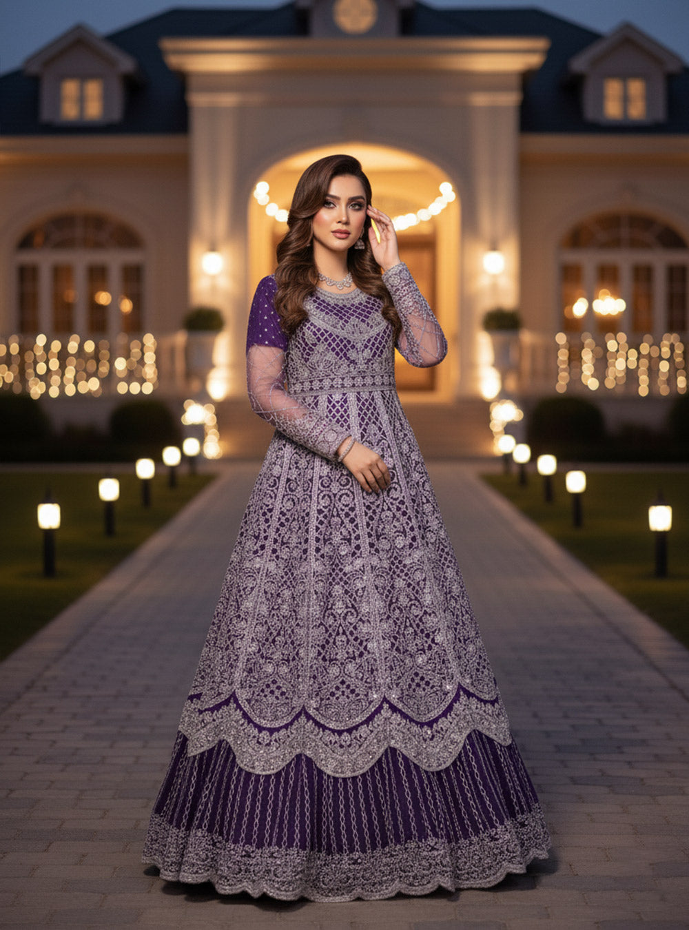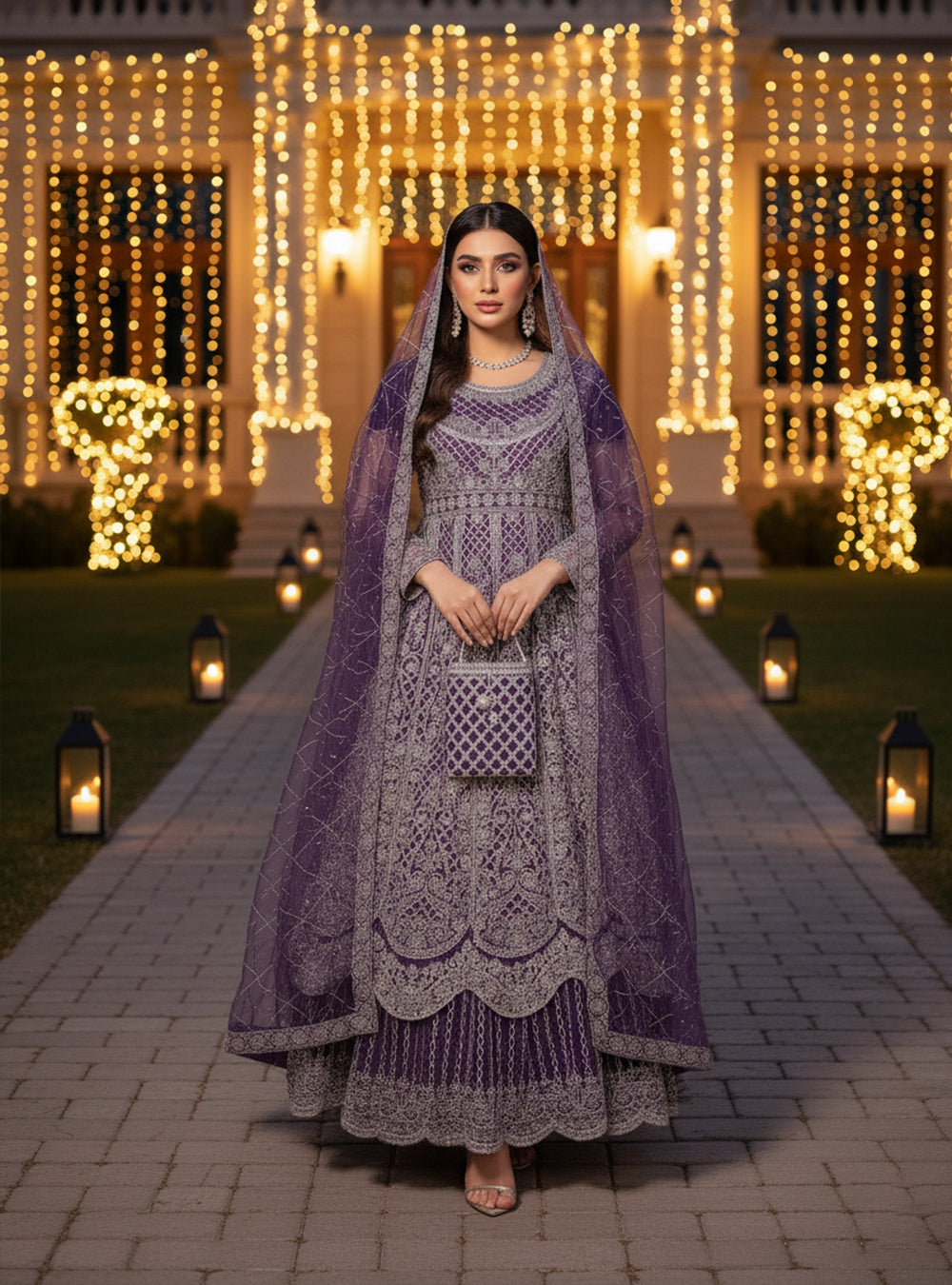 Step into the spotlight with the Lavender Net Gown Ensemble, a captivating three-piece outfit crafted for sophisticated evening wear. This stunning outfit features a delicate Lavender Net Gown with an elegant maxi length and a matching dupatta, offering an ethereal drape and a graceful silhouette. The ensemble is lavishly adorned...
