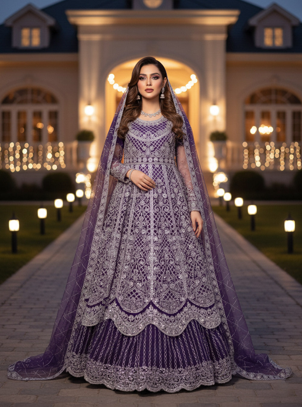 This stunning outfit features a delicate Lavender Net Gown with an elegant maxi length and a matching dupatta, offering an ethereal drape and a graceful silhouette. The ensemble is lavishly adorned with intricate embroidery, shimmering pearls, and subtle mirror work, creating a luxurious texture and glittering finish that catches the light beautifully. The soft mint hue is perfectly complemented by the opulent embellishments, making this a perfect choice for formal gatherings and celebrations.