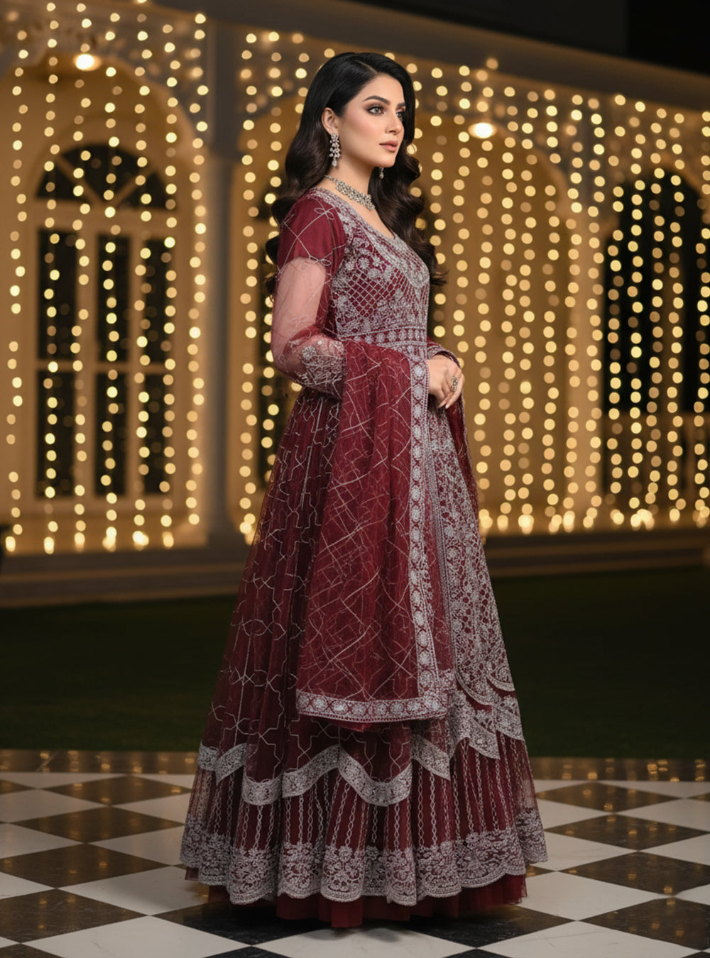 This stunning outfit features a delicate Regal Red Net Gown with an elegant maxi length and a matching dupatta, offering an ethereal drape and a graceful silhouette. The ensemble is lavishly adorned with intricate embroidery, shimmering pearls, and subtle mirror work, creating a luxurious texture and glittering finish that catches the light beautifully. The soft mint hue is perfectly complemented by the opulent embellishments, making this a perfect choice for formal gatherings and celebrations.
