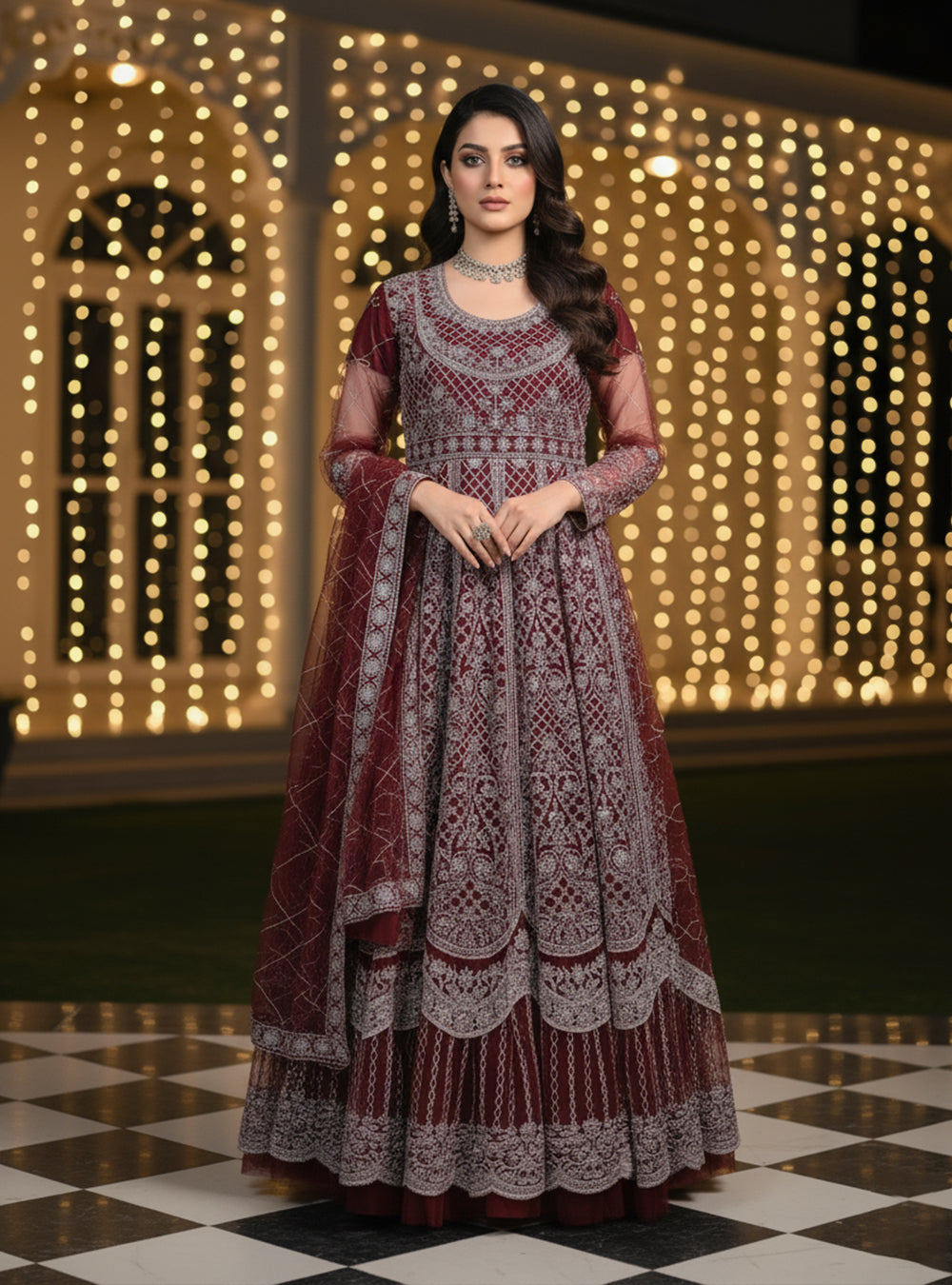 Step into the spotlight with the Regal Red Net Gown Ensemble, a captivating three-piece outfit crafted for sophisticated evening wear. This stunning outfit features a delicate Regal Red Net Gown with an elegant maxi length and a matching dupatta, offering an ethereal drape and a graceful silhouette. The ensemble is...